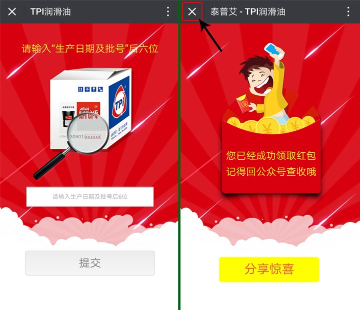 6.進(jìn)入紅包提示頁(yè)面后,關(guān)閉活動(dòng)界面,返回泰普艾潤(rùn)滑油官方微信
